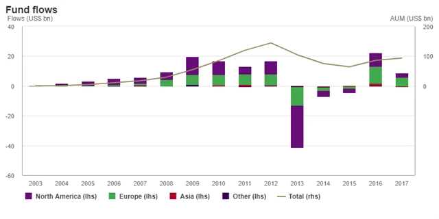 Do evropských fondů přiteklo 5,78 miliardy USD a do severoamerických 2,898 miliardy USD. Asijské zlaté ETF naopak zaznamenaly odliv 404,8 milionu USD. Ve zbytku světa dosáhl odliv investic 32,4 milionu USD.