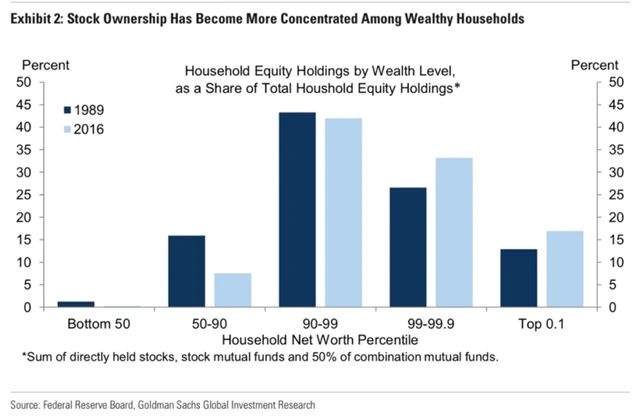 V tomto případě již diverzifikace není tak rovnoměrná. Bohatší lidé vždy patřili k držitelům velké části akcií vlastněných jednotlivci (domácnostmi), ale za posledních třicet let je jasně patrná ještě větší koncentrace akcií v rukou nejbohatších lidí.