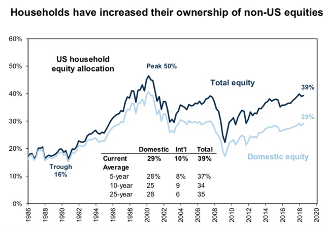 Pozitivní je větší diverzifikace směrem k mezinárodním trhům, zejména po roce 2009. Jedním z důvodů může být globalizace, díky níž je nyní pořízení akcií na trzích mimo USA mnohem jednodušší a levnější než ještě před několika lety. Stále však platí, že americké akcie hrají v portfoliích amerických investorů hlavní roli.