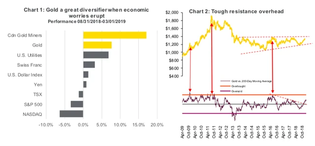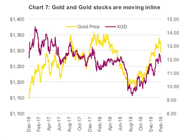 Pokud se podíváme na vývoj ceny kovu od srpna 2018, zlato skutečně mohlo zafungovat jako diverzifikační nástroj. V polovině srpna bylo zlato na minimu, zatímco akcie měly měsíc do dosažení historického maxima. Zatímco americké akcie po zářijových vrcholech ztratily za tři měsíce de facto 20 %, zlato posilovalo až do února a přidalo více než 13 %. Akciím producentů kovu se přitom dařilo ještě lépe.
