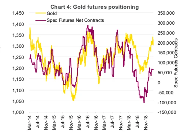 Na dalším grafu je vidět, že obchodníci s futures jsou také stále více nakloněni nákupům zlata. Poté, co loni čisté prodeje dosáhly extrémní úrovně, jsou spekulanti opět na straně kupujících s potenciálem dalšího růstu (společně s cenou zlata).