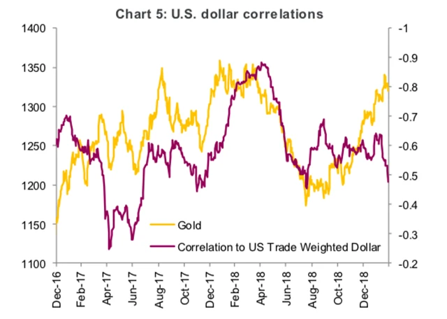 Zlato je oceňováno v dolarech, takže jeho vztah k hodnotě americké měny je inverzní. V poslední době ovšem tato negativní korelace slábne a posiluje jak dolar, tak zlato. Dolar i zlato jsou považovány za bezpečné přístavy a je docela zajímavé sledovat jejich současný růst.