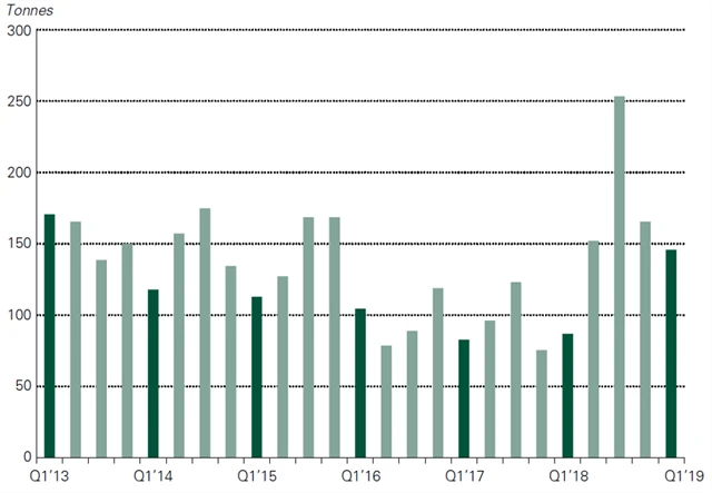 Centrální banky v prvním čtvrtletí zvýšily nákupy zlata o 68 % na 145,5 tuny, což je nejvyšší objem za první kvartál od roku 2013. Největším kupcem kovu byla opět ruská centrální banka (55,3 tuny), která dále razantně snižovala podíl americké měny ve svých rezervách.