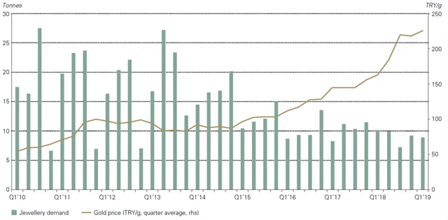 Turecko - poptávka po zlatých špercích a vývoj ceny zlata v turecké liře