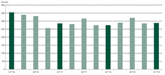 Světové dodávky zlata na trh se v období od ledna do března nepatrně snížily z 1 153,1 tuny na 1 150 tun. Objem vytěženého zlata se zvýšil o procento na 852,4 tuny, nárůst produkce kovu zaznamenaly Kanada nebo Rusko, pokles naopak Čína, Argentina nebo Indonésie. Objem kovu získaného recyklací byl vyšší o 5 % a dosáhl 287,6 tuny.