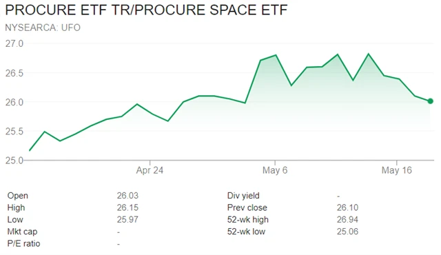Procure Space ETF (s velice hezkým tickerem UFO) se zaměřuje na akcie firem, které významnou část tržeb čerpají ze služeb a produktů, které pomáhají se softwarem, hardwarem i samotnou lidskou přítomností ve vesmírném prostoru. Poplatek za investici do UFO je 0,75 % a fond se obchoduje na trhu NYSE Arca.