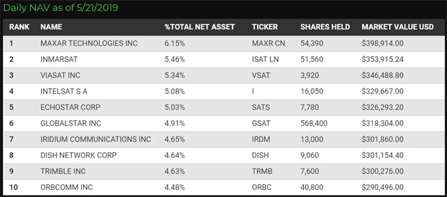 UFO může na první pohled působit podobně jako fondy zaměřené na letectví a zbrojařství. Vedení fondu se jej ale snaží co nejvíce odlišit. Mezi největší pozice v 30položkovém portfoliu ETF se řadí firmy jako Iridium Communications, Inmarsat, Viasat, Trimble Navigation a Sirius XM. Nejvíce zastoupeny jsou sektory komunikačních služeb, průmyslu a informačních technologií. Geograficky je fond nejvíce zaměřen na USA, Francii a Spojené království.