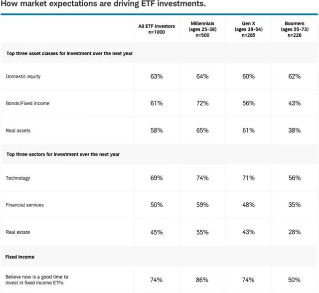 Z hlediska zaměření vedou zejména technologie, do nichž v příštím roce plánuje investovat až 69 % investorů. Vzhledem k očekávaným problémům se téměř dvě třetiny investorů chystají investovat do ETF zaměřených na cenné papíry s pevným výnosem.