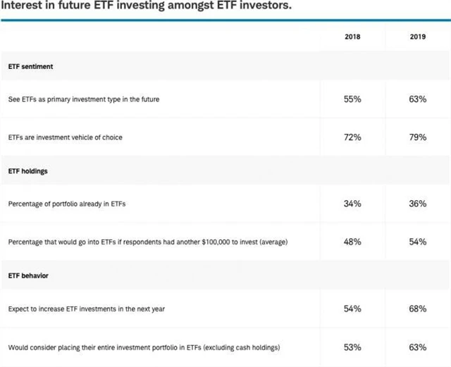 Většina investorů, kteří již do ETF vkládají peníze, má v plánu své pozice v těchto produktech navyšovat. Vyplývá to z každoroční ETF Investor Study by Charles Schwab, která vychází z odpovědí 1 500 lidí, kteří nakoupili ETF v posledních dvou letech. "Po deseti letech zisků nyní investoři do ETF vnímají možné problémy. A plánují využít právě ETF k tomu, aby tyto problémy překlenuli," říká Kari Drollerová ze společnosti Charles Schwab.