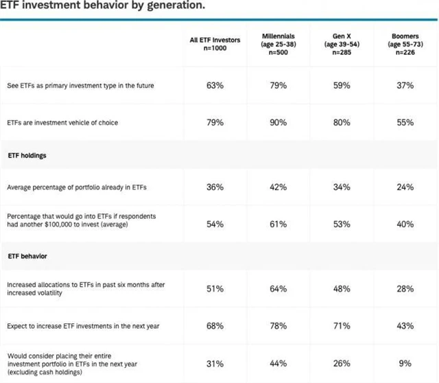 Největšími příznivci ETF v rámci generací jsou jednoznačně mileniáni. Až 80 % z nich považuje ETF za primární investiční nástroj v budoucím portfoliu a 4 z 10 by v budoucnu neváhali vložit všechny své na investice určené peníze (kromě hotovosti) právě do ETF.