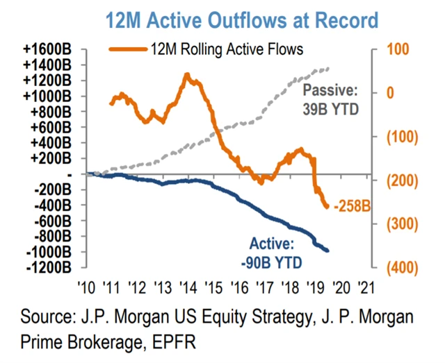 Je zajímavé, že zatímco algoritmické modely jsou populární mezi profesionály na Wall Street, pasivní fondy a ETF si získaly přízeň především běžných lidí (Main Street). Podle JPMorgan, která se nedávno vytasila s podíly zmíněnými v úvodu, jen letos do pasivně spravovaných fondů připlulo dalších 39 miliard dolarů, zatímco z aktivně řízených zmizelo 90 miliard dolarů.