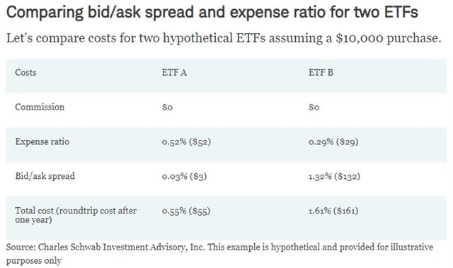 Jak ukazuje následující srovnání, některé ETF nebo nabídky brokerů se na první pohled mohou zdát výhodnější (levnější) než jiné, větší bid/ask spready ovšem cenový poměr otáčí.