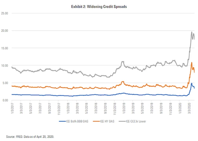 Spready na dluhopisovém trhu zamířily prudce vzhůru a ty u bondů se známkou CCC a horší vyskočily o 9,8 procentního bodu. Investoři zkrátka zvolili sázku na jistotu a přesouvali peníze do bezpečných státních dluhopisů s vysokým ratingem. Nárůst spreadů v rámci jednoho měsíce byl nejvýraznější od roku 2008.