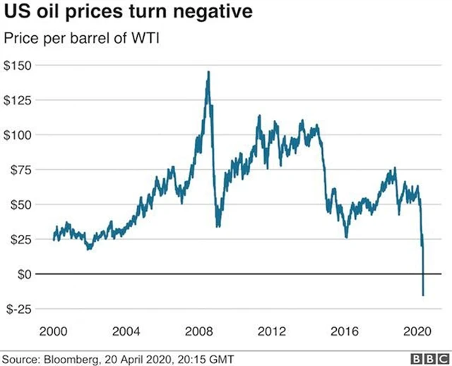 V druhé polovině dubna se futures na ropu propadly pod nulu. Jinými slovy tak těžaři suroviny platili odběratelům za dodávky černého zlata. Poptávka po surovině se totiž vlivem "zastavení" ekonomického života prudce propadla, skladovací kapacity se začaly plnit a těžaři se obávali, že nově získanou surovinu nebudou mít kam uložit.