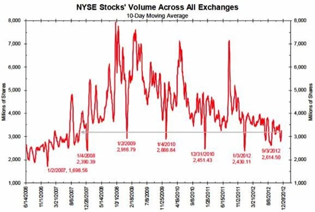 "Klesající objem obchodů (měřený počtem zobchodovaných akcií) na NYSE je způsoben řadou faktorů - od odlivu investorů na jiné trhy přes růst cen některých nejvíce obchodovaných titulů po rostoucí popularitu pasivního investování," tvrdí Barry Rithotz.