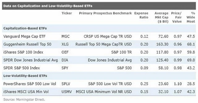 OEF sleduje 100 akcií z indexu S&P 500 a XLG 50 největších společností z indexu Russell 1000, což mu poskytuje nejvyšší průměrnou tržní kapitalizaci, a to 163,3 miliardy USD. DIA sleduje známý index Dow Jones Industrial Average, tedy cenově vážený index blue-chip společností. Nejlevnější variantou je MGC, ale jeho benchmarkový index CRSP US Mega Cap neposkytuje tak čistou expozici v mega-cap společnostech.