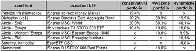 V případě konzervativního portfolia byla největší část prostředků zainvestována do ETF sledujícího vývoj koše eurových státních a podnikových dluhopisů. Druhé nejvyšší zastoupení získal fond kopírující vývoj indexu peněžního trhu eb.rexx Money Market. Do portfolia byly zařazeny i ETF zaměřené na světové a evropské akcie.