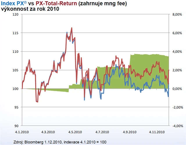 PX-Index-Fond je tzv. Total Return Fund, což znamená, že dividendy jsou plně reinvestovány. Celý dividendový výnos, který se pohybuje u indexu PX okolo 3 až 4 %, se tedy vrací zpět do fondu. V praxi to vypadá tak, že díky plnému reinvestování dividend se dá očekávat, že fond ve střednědobém a dlouhodobém horizontu předčí svou výkonností index PX. Všechny akcie jsou obsaženy v portfoliu plnou vahou, tím se vyznačuje plná replikace indexu.