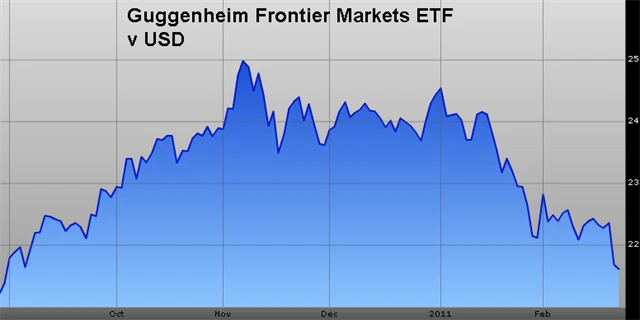 Výkonnost Guggenheim Frontier Markets ETF se pohybuje v souladu s Bank of New York Mellon Frontier CR Index. Jedná se o fond investující v Chile, Kolumbii, Egyptě, Argentině a Peru.