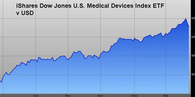 iShares Dow Jones U.S. Medical Devices Index ETF se snaží odrážet výkon indexu Dow Jones U.S. Select Medical Equipment, který by měl těžit ze současné situace kolem Obamových reforem zdravotnictví.