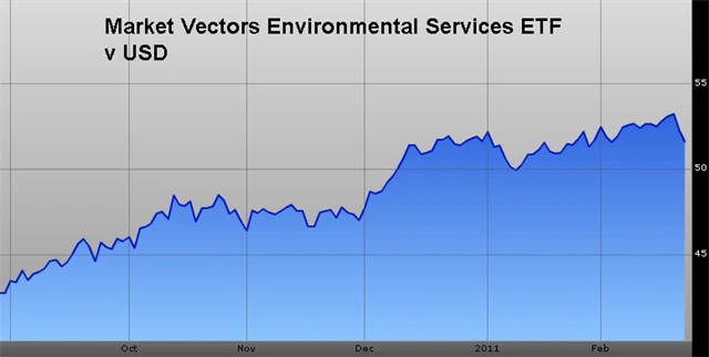 Market Vectors Environmental Services ETF se snaží kopírovat výnosnost indexu Amex Environmental Services. Mezi jeho hlavní investice patří Stericycle, Waste Management, Republic Services a Newpark Resources.