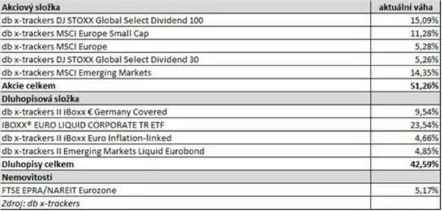 Ke konci ledna letošního roku tvořily akcie přibližně polovinu portfolia. Nejvyšší zastoupení měly fondy investující do akcií z indexů DJ Stoxx Global Select Dividend 100, MSCI Emerging Markets a MSCI Europe Small Cap. Další ETFka zařazené ve fondu jsou uvedeny v tabulce.