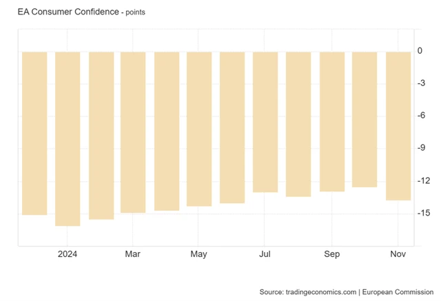 Index ekonomické nálady v eurozóně sestavovaný Evropskou komisí v listopadu podle finálních údajů vzrostl na 95,8 bodu z říjnových 95,7 bodu. Index důvěry v průmyslu se zvýšil na -11,1 bodu (říjen: -12,6 bodu revidováno z -13 bodů) a index důvěry ve službách klesl na 5,3 bodu (říjen: 6,8 bodu revidováno z 7,1 bodu). Index spotřebitelské důvěry se snížil na -13,7 bodu z říjnových -12,5 bodu.