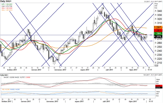 Cena zlata měla v letošním roce silný cyklus, kdy prudký růst střídal silný pokles. Jak růsty, tak poklesy v minulosti probíhaly víceméně stejnou rychlostí (kanály měly stejnou směrnici). V průběhu října se dalo hovořit o výrazném zvýšení frekvence cyklu. Strmý nárůst trval jen 10 dnů, totéž platí pro následující strmý pokles. Od minulého týdne se ale nejvíce projevuje horizontální cenový kanál 1 265 až 1 280. V současnosti se cena blíží k rezistenci na 1 280. Technické indikátory nevysílají silné signály.