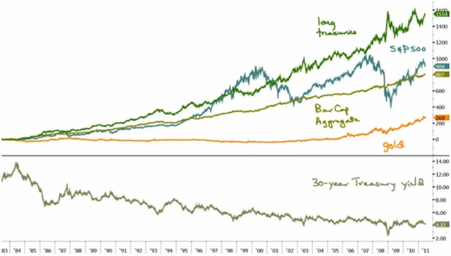V grafu je zobrazeno období od roku 1983. Charakteristický pro něj byl setrvalý pokles úrokových sazeb, který lze odvodit z křivky ve spodní části grafu.