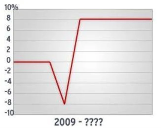 Další teorie v naší abecedě ekonomického oživení připomíná tvar druhé odmocniny. Nejdřív se dotkneme dna; pak nastane prudký vzestup; ten se posléze zastaví a srovná, a v této rovině zůstaneme do té doby, než se ekonomika opět plně oživí.