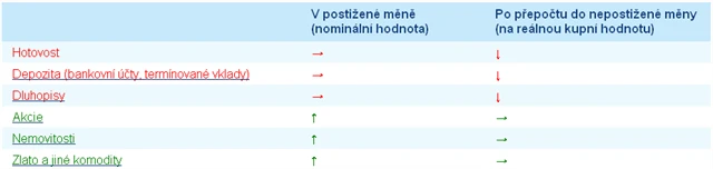 V tabulce je graficky znázorněno, že nominální hodnota papírových aktiv (červená) zůstává při hyperinflaci nebo měnové devalvaci konstantní, tudíž jejich reálná hodnota klesá. Hmotná aktiva (zelená) si reálnou hodnotu udržují, jejich nominální cena v postižené měně roste.