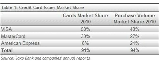 MasterCard se podobá investicím, které Buffett uskutečnil v případě American Express a Visa, což jen zdůrazňuje jeho vnímání potenciálního odklonu od úhrad v hotovosti. Jen málo společností se dnes může chlubit takovým globální záběrem jako Visa, American Express a MasterCard mají v případě bezhotovostních plateb. Nepřekvapí tak, že Warren Buffett má v portfoliu Berkshire všechny tři společnosti, které dají dohromady tržní podíl asi 91 %.
