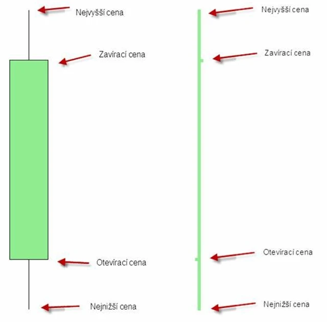Zaměříme se totiž na základní stavební kámen cenového grafu, kterým je každá jednotlivá svíčka, případně čára. Když se detailně podíváme na svíčku (čáru), můžeme díky ní identifikovat čtyři klíčové ceny – otevírací, zavírací, nejvyšší a nejnižší (anglicky Open, Close, High a Low).
