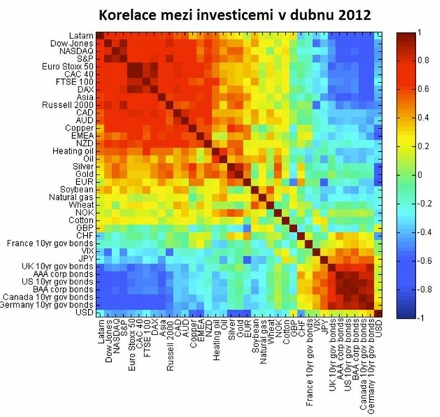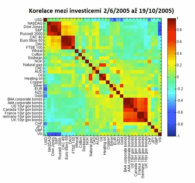 Červená barva v matrici odráží silnou pozitivní korelaci (investice se pohybují ruku v ruce), modrá silnou negativní korelaci (investice se vyvíjejí opačně). Zelená a žlutá barva se objevují v případě, že se korelace blíží nule.