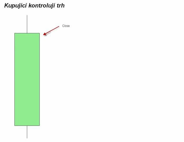 2. Zavírací cena je poblíž high dané svíčky a daleko od otevírací ceny. V tomto případě jsou kupující silnější stranou a kontrolují trh. Trh otevřel na nižší ceně a ta během zvoleného časového úseku rostla, protože byla nízká nabídka daného podkladového aktiva.