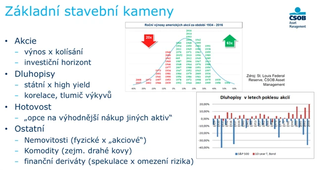 I vzhledem k (možné) blížící se bouři je proto vhodné si připomenout rady předních domácích expertů, kteří se na jaře zapojili do druhého cyklu seminářů ABCD začínajícího a mírně pokročilého investora. Tentokrát tedy logicky pokračujeme pohledem na dluhopisy, jeden ze dvou pilířů tradičního modelového portfolia. V něm, jak připomíná hlavní stratég ČSOB Asset Management Aleš Prandstetter, by (kvalitní) dluhopisy měly sloužit k tlumení tržních bouří, a to díky nízké korelaci s rizikovějšími akciemi.