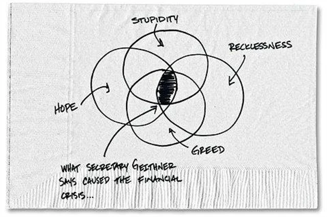 Většina z nás to ví, ale nechce si to přiznat. Finanční krize jsou způsobeny kombinací našich nejhorších vlastností: hlouposti, chamtivosti, bezohlednosti a přehnaného sebevědomí. Dokonce i naděje. Mnoho lidí uznává, že jejich chování ke krizi přispělo, ale významně podceňují roli výše zmiňovaných vlastností. Jejich mix přitom může zapříčinit i některé osobní katastrofy.