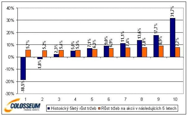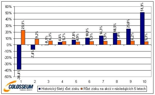 Z druhého grafu je zřejmé, že firmy, které se v minulosti potýkaly s poklesem zisků, mají tendenci v následujících 5 letech překvapit prudkým růstem. Naopak společnosti s vysokým tempem růstu většinou nejsou schopny toto tempo zopakovat a růst se vrací k průměrným hodnotám, což je velmi často doprovázeno zklamáním v řadách investorů a poklesem cen akcií.
