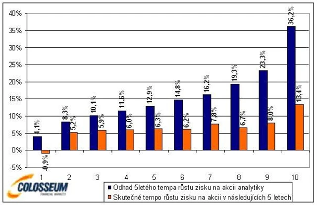 V neposlední řadě zkoumala studie úspěšnost analytiků při predikci tempa růstu zisků firem v následujících pěti letech. Výsledek pravděpodobně příliš čtenářů nepřekvapí. Analytici nebyli schopni správně určit přesné tempo růstu zisků na akcii, přičemž měli tendenci toto tempo výrazně nadhodnocovat. Nejoptimističtější odhady se zároveň ukázaly být nejméně přesné. Mezi predikcemi a skutečným růstem však byla vypozorována korelace. Analytici byli schopni správně definovat akcie s největším a nejmenším tempem růstu v následujících 5 letech.