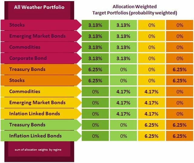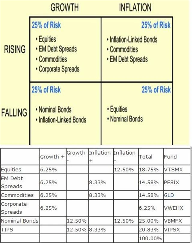 Každou třídu aktiv, kterou použil, pak "zapákoval" tak, aby měla přibližně stejnou rizikovost, ale aby zároveň zhodnocení nebylo závislé primárně na akciích, které jsou v "dobrých časech" nejvýnosnější. Výsledné portfolio je v uvedených "režimech" stabilnější, investor se tedy vyhne vysoké volatilitě.
