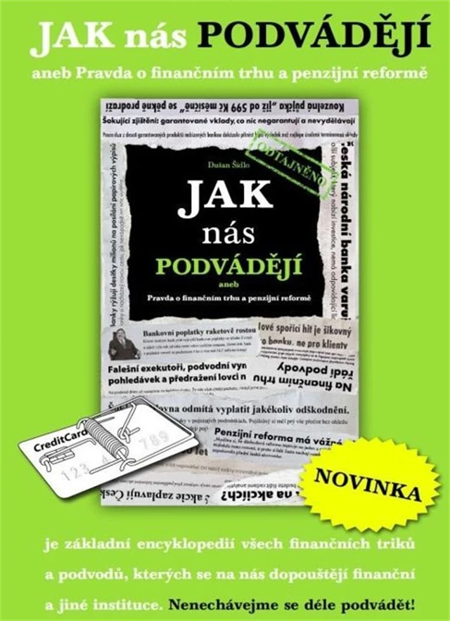 Kdo je Dušan Šídlo? Déle než deset let bojuje za práva klientů na finančním trhu. Je autorem stovek článků o penězích a knihy "Život jako riziko". Finanční poradenství je jeho hobby, dočítám se na zadní straně knihy. Její obálka upozorňuje na to, že autor odtajnil fakta, která jsou nám, obyčejným lidem, neznámá. Je zde totiž razítko ODTAJNĚNO. V záplavě písmenek a novinových článků se mi těžko hledá jméno autora. Je napsáno drobným zeleným tenkým písmem, což svědčí o jeho skromnosti. Otvírám tedy knihu, jejíž doporučená cena je 315 Kč. Vyrobily ji Aladin Agency a EKON, družstvo Jihlava. Jedná se o první vydání 200 stran tajností.