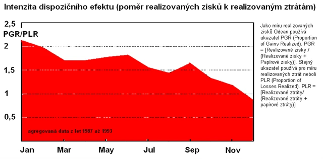 z porovnání ziskových a ztrátových pozic stejné velikosti vyplývá, že investoři raději prodávají své vítěze a drží své poražené, ačkoli obchodní náklady (trading costs) jsou u obou přibližně stejné;