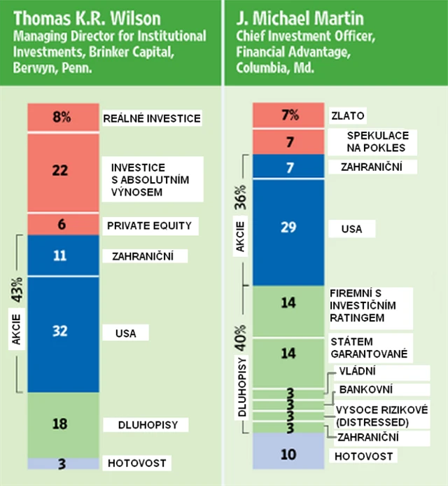 Dluhopisy by měly být zastoupeny poměrně výrazně. Jak konkrétně, to záleží na přístupu toho kterého portfoliomanažera. Sam Katzman, stratég Constellation Wealth Advisors, doporučuje vyváženost. Vytvořil portfolio z amerických vládních dluhopisů, z něhož 70 procent tvoří 1- až 5leté dluhopisy a 30 procent dluhopisy splatné za 7 až 8 let. "Chceme využít dlouhodobé vyšší výnosy, ale zároveň se nevystavit dopadům případné inflace vyvolané vládními kroky," vysvětluje Katzman. Absolutní výnos portfolia vyžaduje zahrnutí alternativní složky – od private equity po hedgeové fondy a jejich strategie. Shortování, nebo třeba sázky na přiblížení se kurzů akcií kupované firmy a koupené firmy v rámci nějaké akvizice.