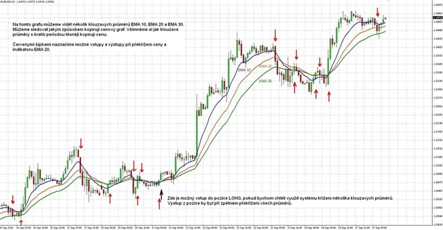 EMA = exponenciální klouzavý průměr – přikládá větší váhu posledním časovým úsekům v dané periodě