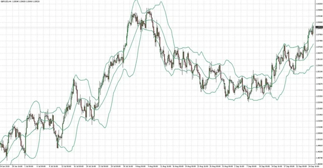kolem prostřední křivky je vytvořena obálka proměnlivé šířky. Obálku tvoří r násobek směrodatných odchylek n posledních zavíracích cen