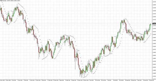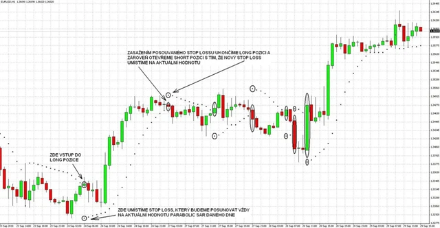 Parabolic stop and reverse indikátor sleduje vývoj trendu. Je ovlivňován cenou a časem. Čas se projevuje tím, že indikátor se pohne i v případě, že cena se nevyvíjí žádným směrem. Cena se projeví v indikátoru v závislosti na tom, jak výrazná je změna této ceny.
