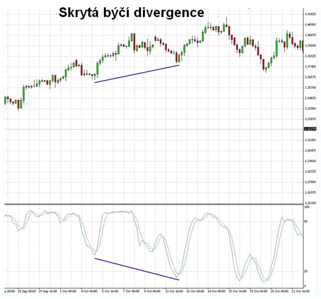 Cena vytváří nižší low a indikátor vytváří vyšší low. Predikuje možný obrat trendu nahoru.