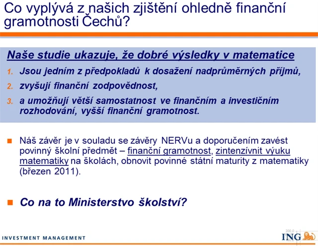 Finanční krize ovlivnila přístup Čechů k penězům. Chtějí větší stabilitu investic, ale zároveň je stále zajímají vyšší výnosy než ba účtech v bance. Vyplývá to z aktuálního průzkumu společností ING Investment Management a Ipsos Tambor. V druhé části se studie věnuje finanční gramotnosti.