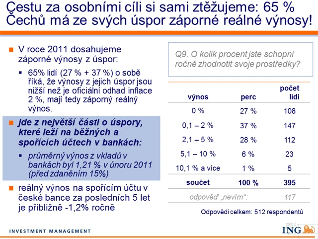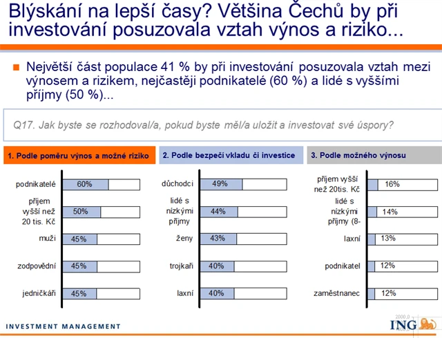 Finanční krize ovlivnila přístup Čechů k penězům. Chtějí větší stabilitu investic, ale zároveň je stále zajímají vyšší výnosy než ba účtech v bance. Vyplývá to z aktuálního průzkumu společností ING Investment Management a Ipsos Tambor. Poslední část je o investicích.