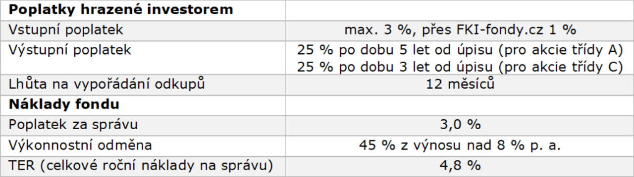 Výstupní poplatek 25 % je účtován u investičních akcií třídy A při zpětném odkupu do pěti let od úpisu, po pěti letech je výstupní poplatek nulový. U investičních akcií třídy C je výstupní poplatek 25 % účtován pouze po dobu 3 let od úpisu, pak je nulový. Minimální investice u této třídy investičních akcií jsou ale 2 miliony korun.